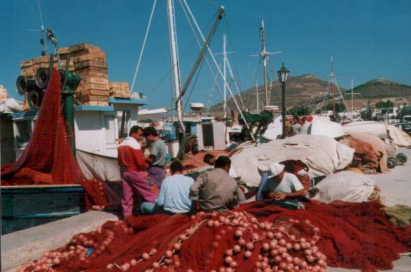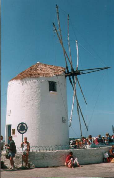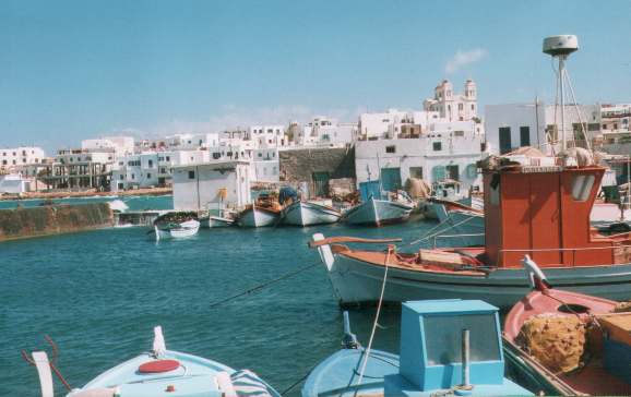 Wenn man mit der Fähre in Parikia, der Hauptstadt von Paros, ankommt ist die Windmühle die erste Anlaufstation (Bild oben). Sie ist Treffpunkt, und früher diente sie als Tourist-Information. Die Stadt wirkt noch ein bißchen idyllischer und ruhiger als Naxos-Stadt. Einen Ausflug Wert ist das kleine Hafenstädtchen Naousa. In dem winzigen Fischerhafen wimmelt es von kleinen bunten Booten. Von hier aus erreicht man auch drei gute Strände. Parikia selbst hat einen Stadtstrand. Wir sind immer mit dem Bus zu einem Strand weiter südlich gefahren. Hier ist es nicht so voll, und die außergewöhnlich hohe Brandung fiel auf. |